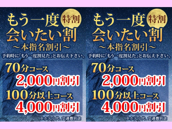 店長コメント いつものあの子にスペシャル価格でご案内!!! 【もう一度会いたい割】 日頃からご愛顧いただいてる皆様に感謝を込めてスペシャル価格をご用意させて頂きました! 70分コース料金+本指名代1,000円 総額から2,000円割引 100分以上のコースでは衝撃の総額から4,000円割引! 過去にお会い頂いた女性へのご予約に適用されますのでご注意くださいませ。 ご予約の際に【もう一度会いたい割】を見たとお伝えください。 ※ホテル代、交通費、本指名代別途 ※他の割引と併用できません。 ※一日一回まで適用 ※ご予約時に、このバナーが【出勤表】に表示されている際にご利用頂けます。 <b><font color="blue">※50分体験コースは対象外です。</font></b> |