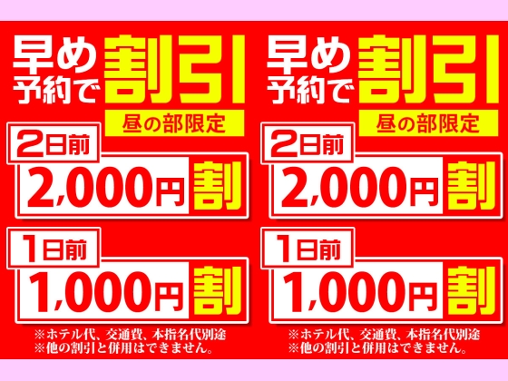 店長コメント 【早め予約割引】 昼の部(10時~19時)限定 ご予約時に【早め予約割引】見ました とお伝えください。 2日前予約:2,000円割引 1日前予約:1,000円割引 ■■■■■■■■■■■■■■■■■■■■■■■■■■■■■■ ※ホテル代、交通費、本指名代別途 ※他の割引と併用できません。 ※このバナーが出勤表に表示されている時間限定です。 <b><font color="blue">※50分体験コースは対象外です。</font></b> |